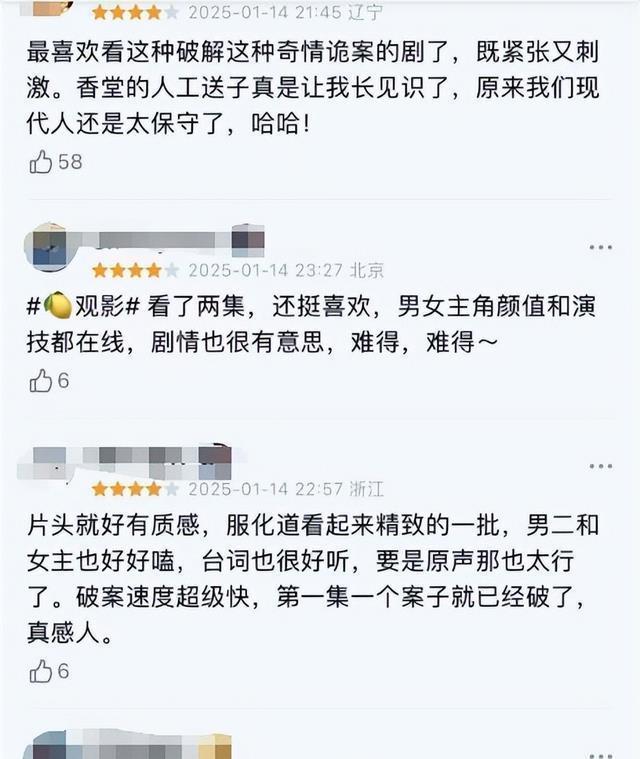 观众们对《锦囊妙录》的评价也是相当高:“奇情诡案既紧张又刺激,香堂的人工送子真是长见识”“看了两集挺喜欢,男女主颜值和演技都在线,剧情也很有意思”“片头很有质感,服化道看着十分精致,破案速度超级快”“整体节奏很快,剧情内容也很值得思考”。
