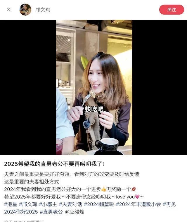 邝文珣听到后更是十分感动!更答应老公不会因为他变好而更加得寸进尺。更发文向老公示爱,叮嘱大家来年都要更爱彼此。不少网友看后都大赞夫妻二人能够这样坦诚又平心静气地对话真的很不错!